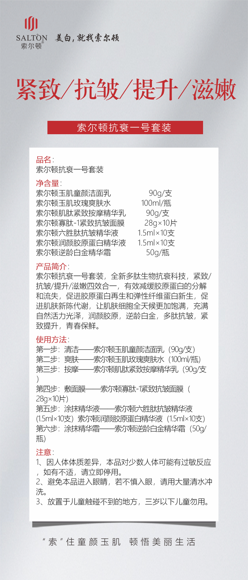 索尔顿玉肌童颜洁面乳 90g/支 索尔顿玉肌玫瑰爽肤水 100ml/瓶 索尔顿肌肽紧致按摩精华乳 90g/支 索尔顿寡肽-1紧致抗皱面膜 28g×10片 索尔顿六胜肽抗皱精华液 1.5ml×10支 索尔顿润颜胶原蛋白精华液 1.5ml×10支 索尔顿逆龄白金精华霜 50g/瓶