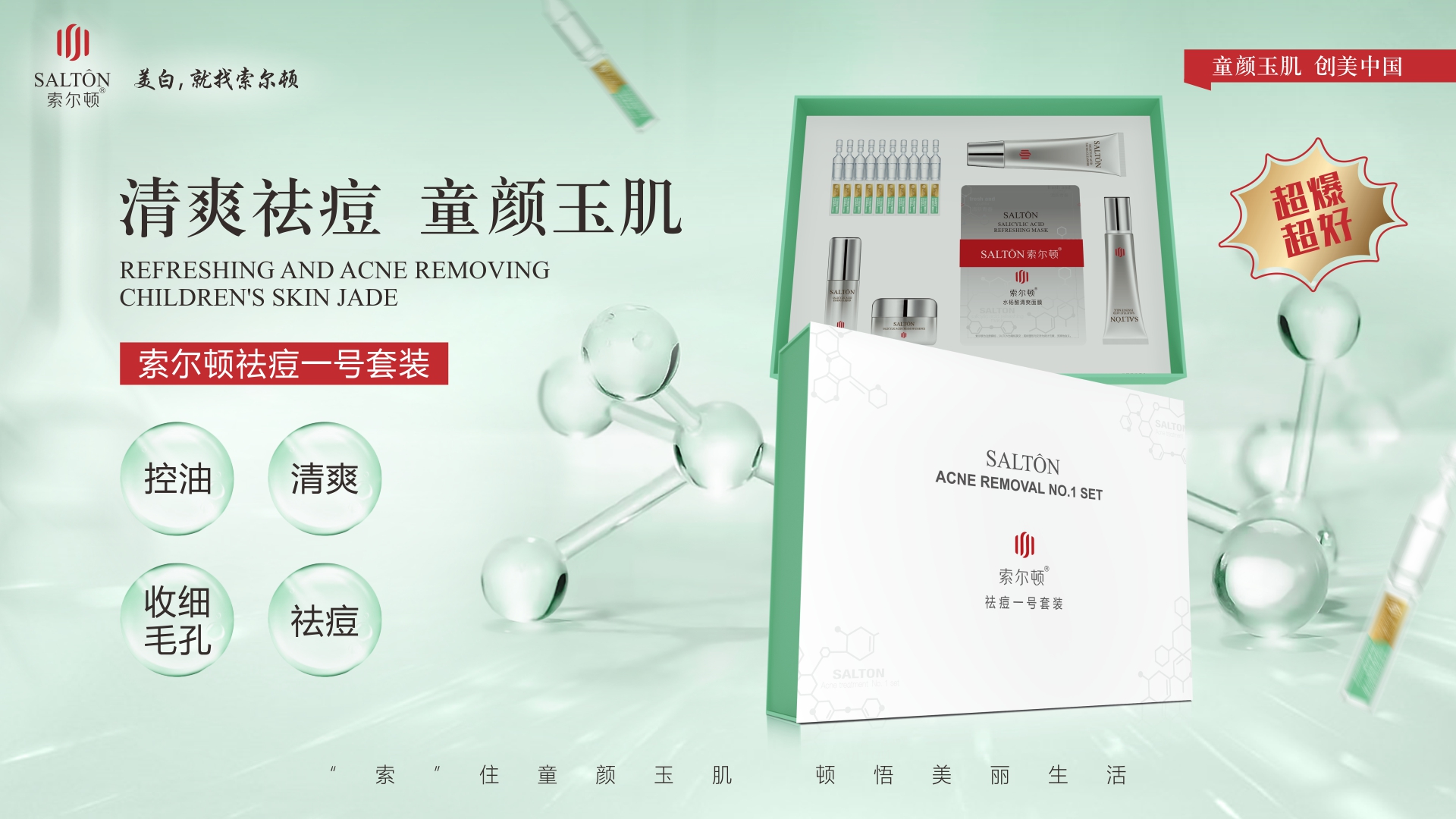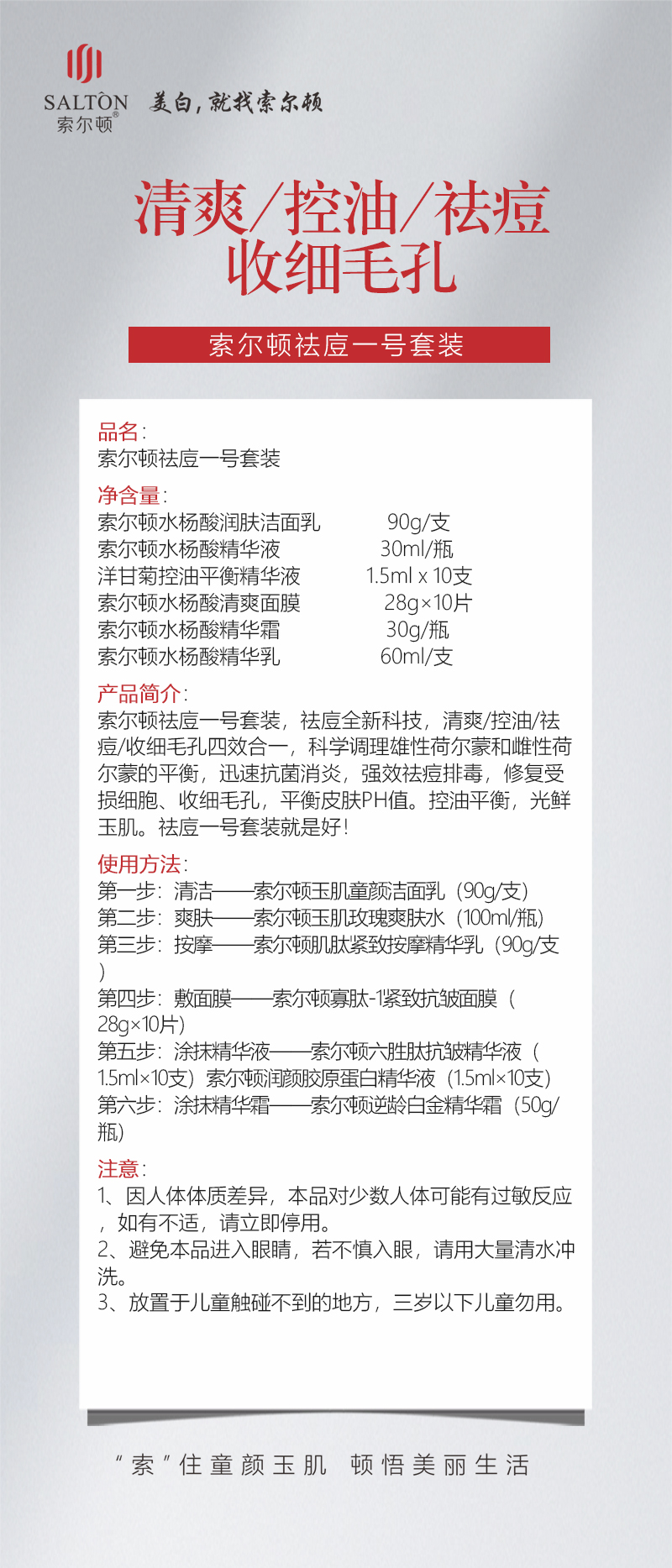 索尔顿水杨酸润肤洁面乳 90g/支 索尔顿水杨酸精华液 30ml/瓶 洋甘菊控油平衡精华液 1.5mlx10支 索尔顿水杨酸清爽面膜 28g×10片 索尔顿水杨酸精华霜 30g/瓶 索尔顿水杨酸精华乳 60ml/支